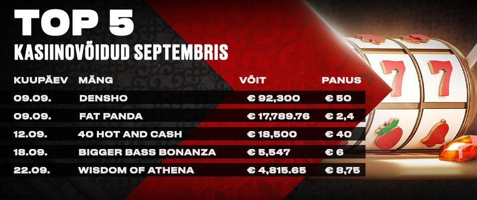 Betsafe Eesti kasiino poolel oli eriti õnnelikuks päevaks 9. september, kui sündis kaks viimase kuu uhkeimat võitu – Densho mängus võitis üks meie kasutaja kopsaka 50-eurose panusega enam kui 90 000 eurot, samal ajal tuli Fat Panda mängus vaid 2,4 euro suuruse panusega võit, mis jäi natuke alla 18 000 euro. Suuri võite tõid sisse veel ka mängud 40 Hot and Dash, Bigger Bass Bonanza ja Wisdom of Athena.