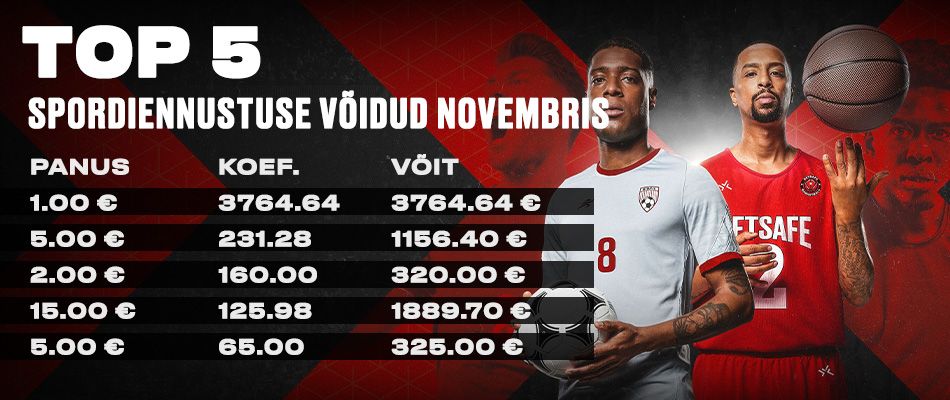 Novembrikuu möödus Betsafe Eesti kasutajatele tulusalt: meie viie suurima spordiennustuses võitnud koefitsiendi tabelisse jõudsid sedapuhku viis väga mõnusat koefitsienti, kusjuures esikohale jõudnud koef oli suurem kui kogu ülejäänud tabel kokku! Vaatame üle, millised mängud ja millised valikud tõid novembrikuus Betsafe Eesti kasutajatele spordiennustuses edu!