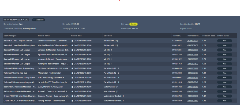 Panused NBA korvpallist Vietnami võrkpalli ja Indoneesia sulgpallini välja – aga kõik valikud läksidki täppi! Individuaalselt jäid koefid 1,24 ja 1,78 vahele, mis tähendab, et panused tehti alati soosikute või tõenäoliste sündmuste peale, aga mis vahet seal on – kõik, kes on proovinud nii suuri kombosid kokku panna, teavad hästi, et mõni pealtnäha lihtne banker oskab lõpuks ikka vääratada. Palju õnne!